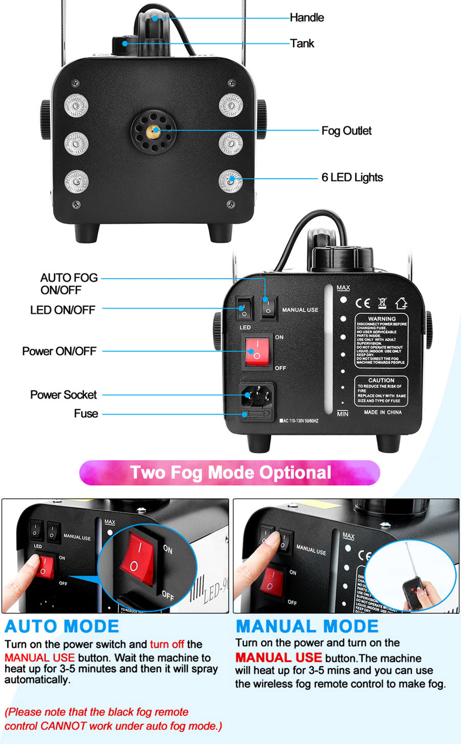 WORKING SEPARATELY: The most outstanding characteristic of this fog machine is that the fog and the light can work in a separate way. There is no doubt that this innovative design can definitely create a unique and special lighting effect for various occasions, such as wedding, stage performance and parties.