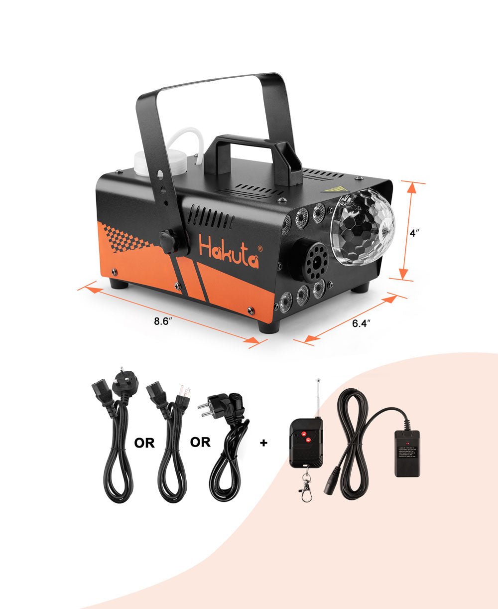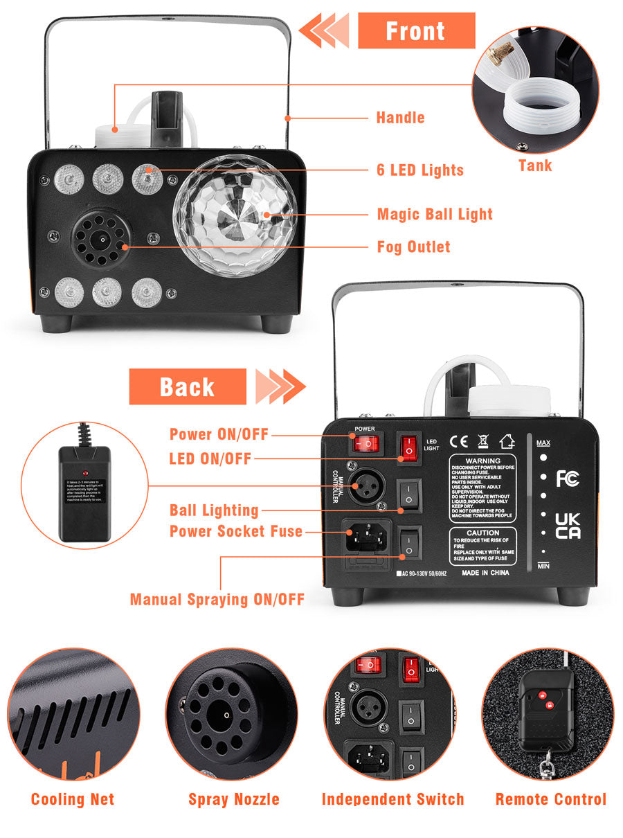 This 600W fog machine has Disco ball lights with automatic color changing function and 6 LED Lights with fixed colors. You can turn on the switch on the back of machine to control coordinately or separately use these Disco lights, LED RGB lights and smoke spray effect. This unique and special type is more energy-saving.