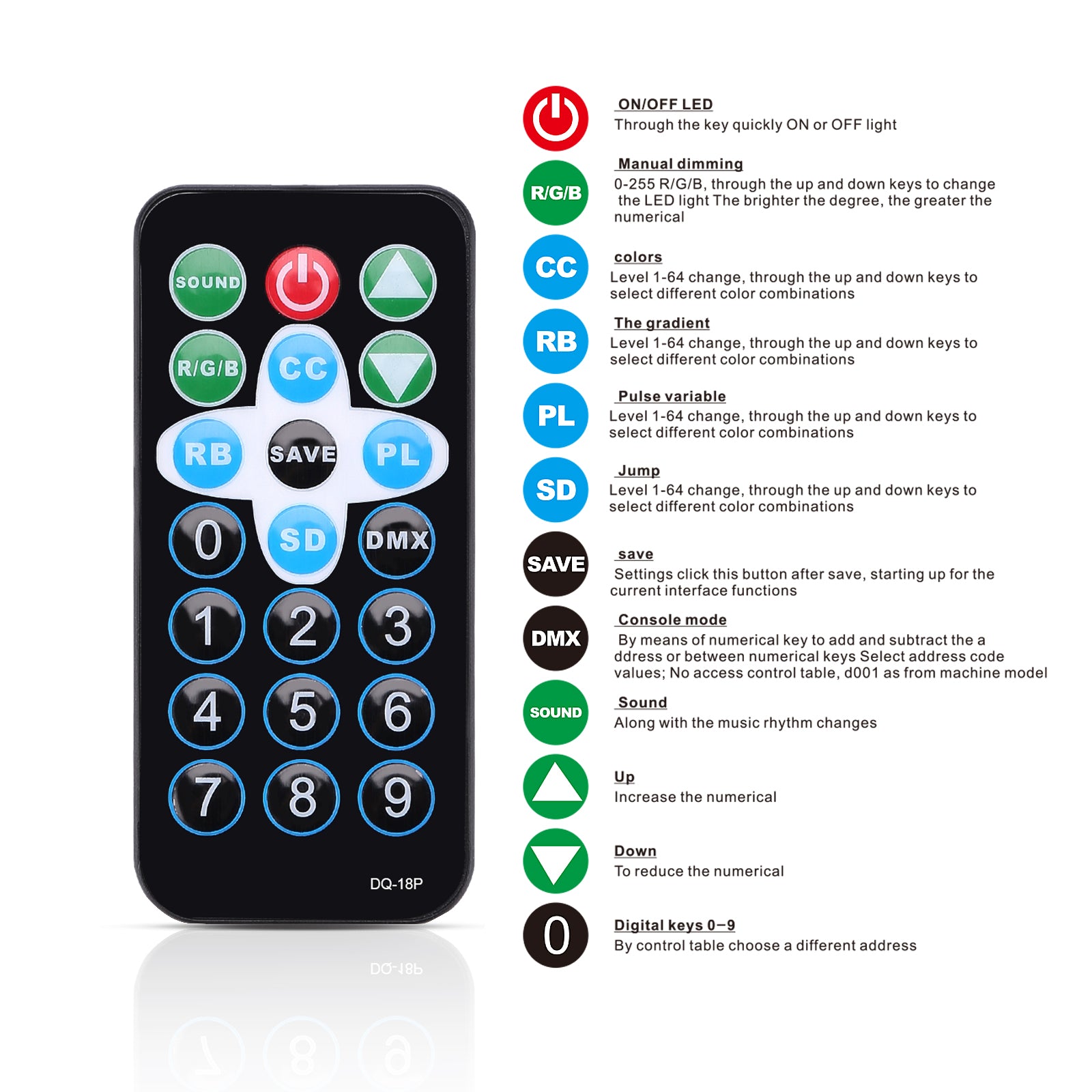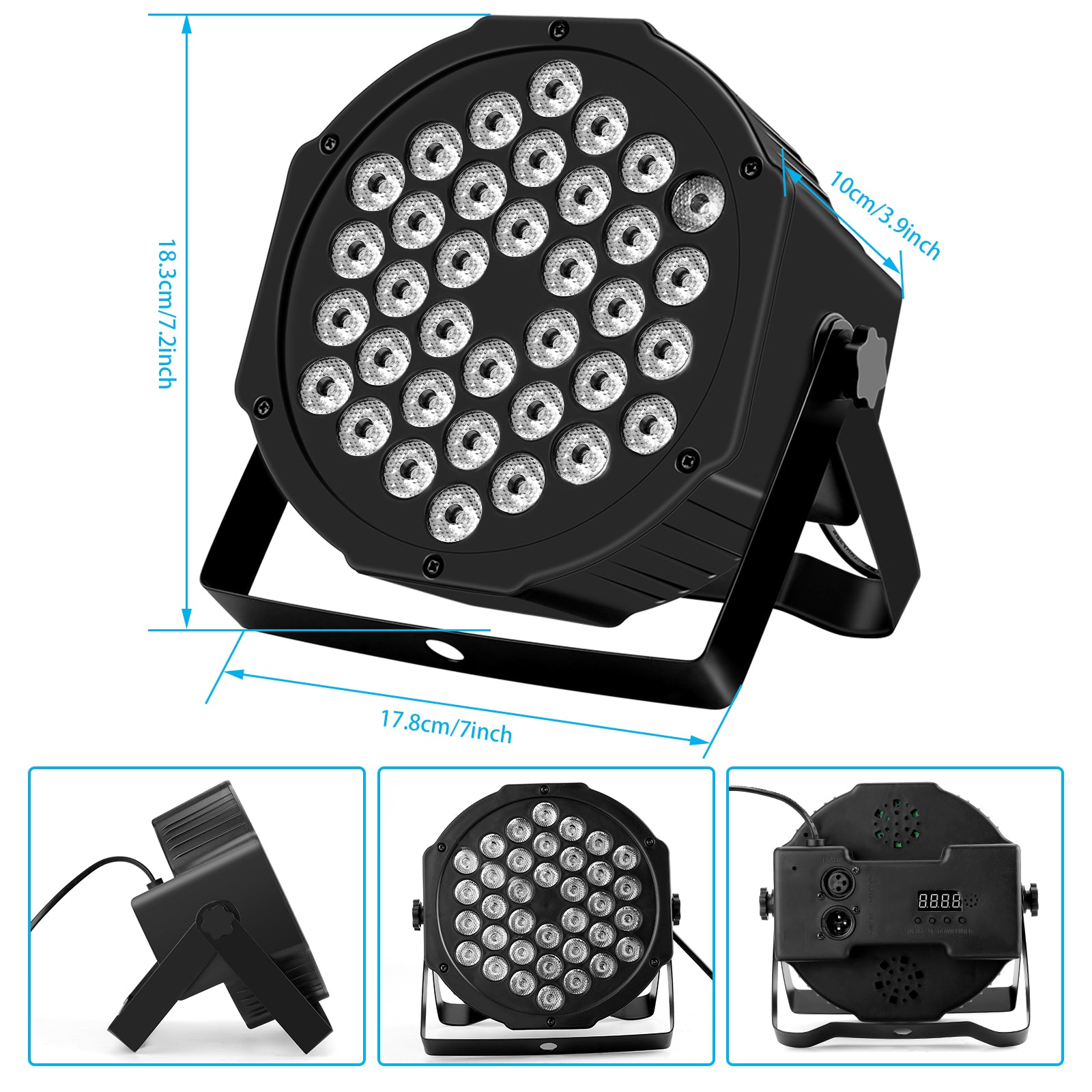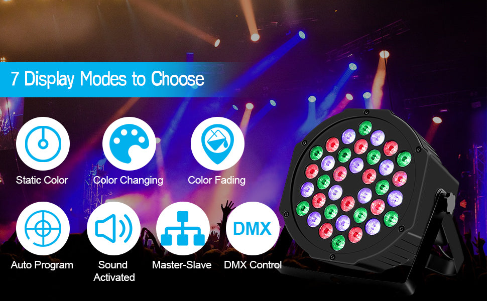 There are 36 LED DJ lights in total. You can select different types of operation modes to help you take control of brightness and velocity for each effect, including color mode (red, green, blue, yellow, purple, cyan and white), static color mode, strobe, skip mode, sound activation mode, auto-cycle mode, active-standby mode, DXM mode and remote control mode.