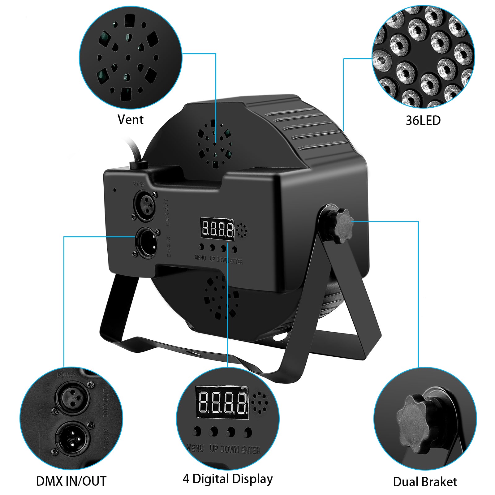 PORTABLE & DUAL-DESIGNED BRACKETThe mounting bracket is easy to carry around because of its compact size and lightweight feature. In this way, the DJ disco stage lights are easy to install and they can be easily hung on the mounting bracket. In addition, you can also use them as floor lights for stage performance.