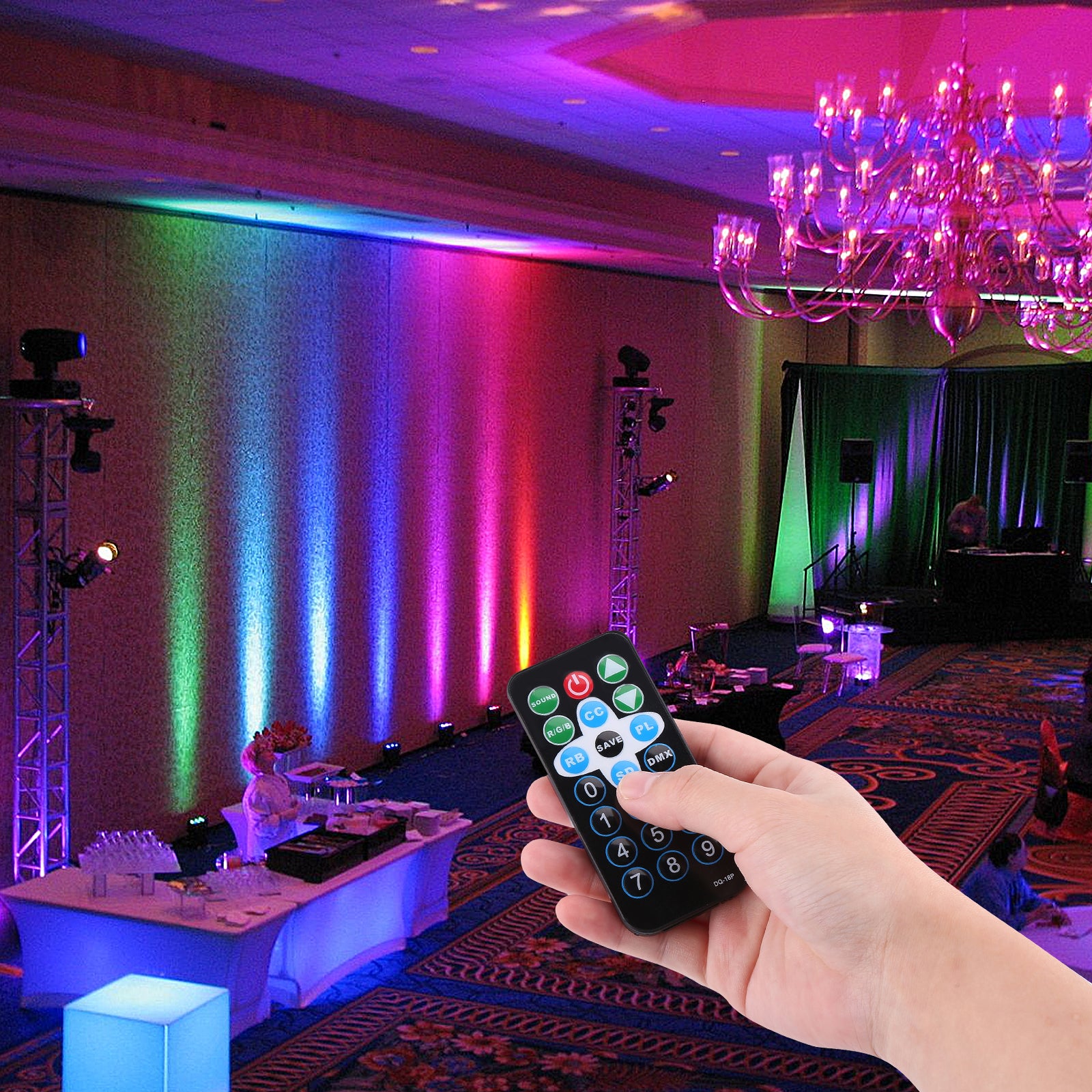 MULTIPLE WORKING MODESThe LED stage lights has 7 working modes: static color mode, strobe, fade in/fade out mode, auto-cycle mode, active-standby mode, DMX mode and remote control mode. The speed of lighting can be adjusted. You can use wireless remote to select and control each mode. The remote can control two DJ lights at one time.